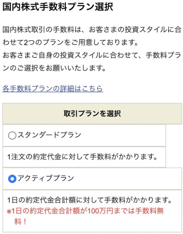 国内株式の手数料プランは、1日の約定代金合計額が100万円までは手数料が無料になるアクティブプランがおすすめです。
