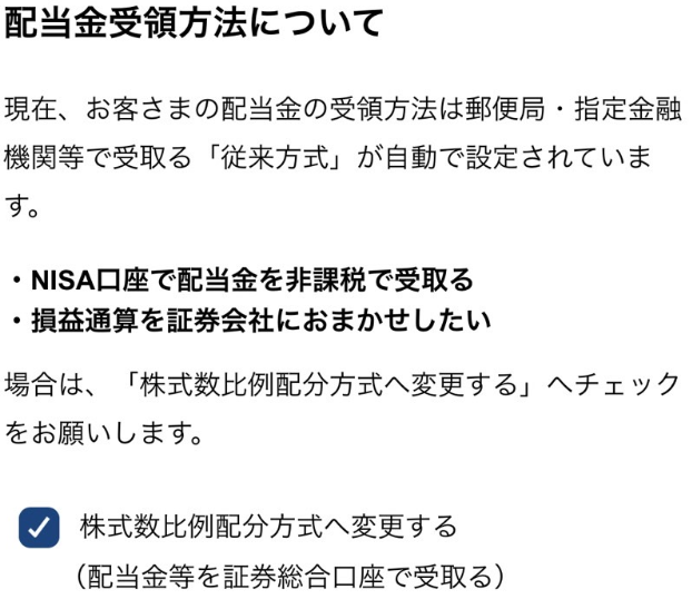 株式数比例配分方式へ変更するをチェックすると配当金は証券口座に振り込みされます。