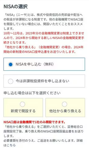 ただし、NISAは1人1口座しか作れません。他社でNISA口座を保有している場合は「他社から乗り換える」を選択してください。