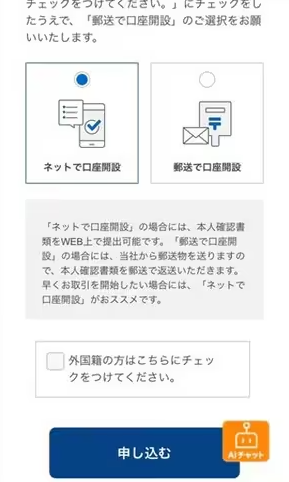 - 口座開設方法を選択する(ネットもしくは郵送)