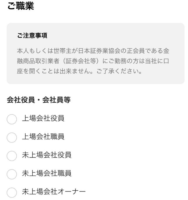 ・職業欄は、一般会社員の方は上場企業か未上場企業か選択してください。